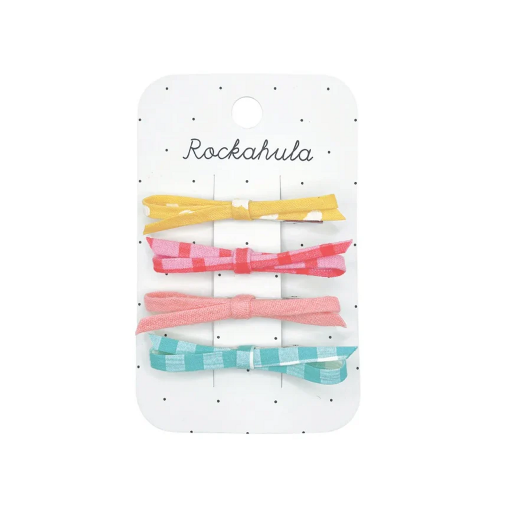 Add a pop of colour with this fun pack of 4 bow clips. Featuring our super fun printed fabrics in bright colours, each bow is set onto an easy to wear crocodile clip. Wear them one at a time or all at once!