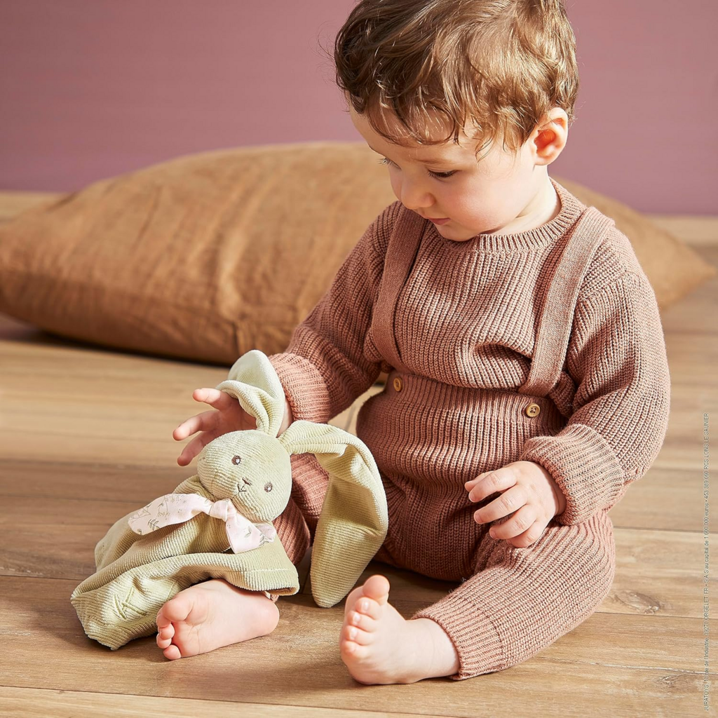 Measuring 30 cm, this cheerful green rabbit will bring affection and comfort to your child. Its bi-material design combines soft corduroy with lightweight viscose, providing incomparable softness and comfort for your little one. This green bunny blanket is refreshingly elegant, with a refined, delicate style. Its little scarf gives it a fresh touch, adding a touch of originality to its appearance.