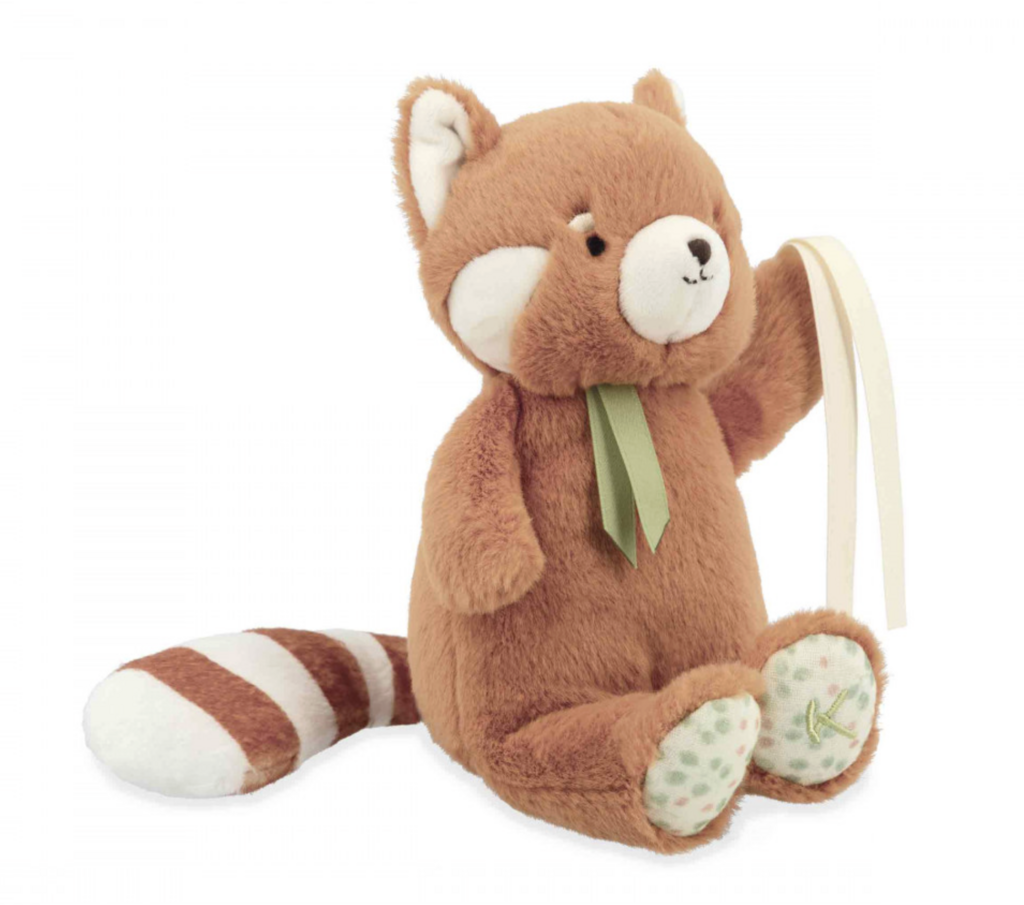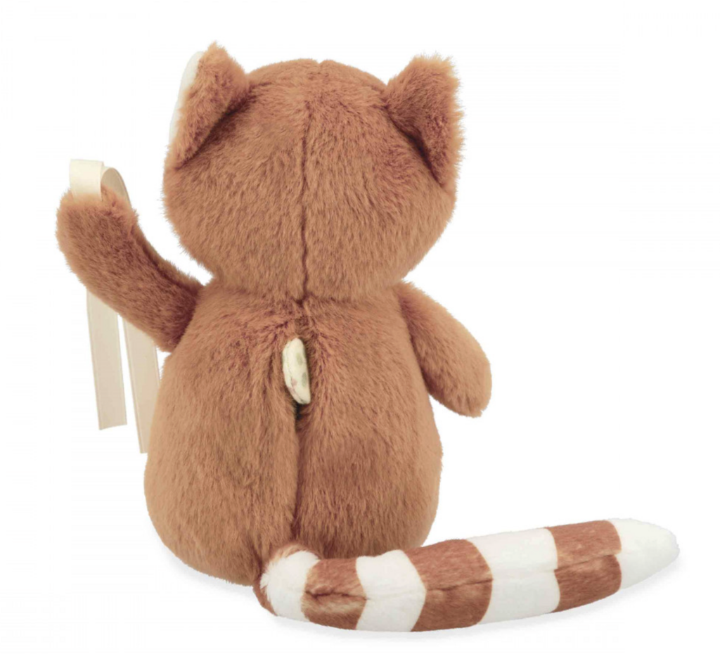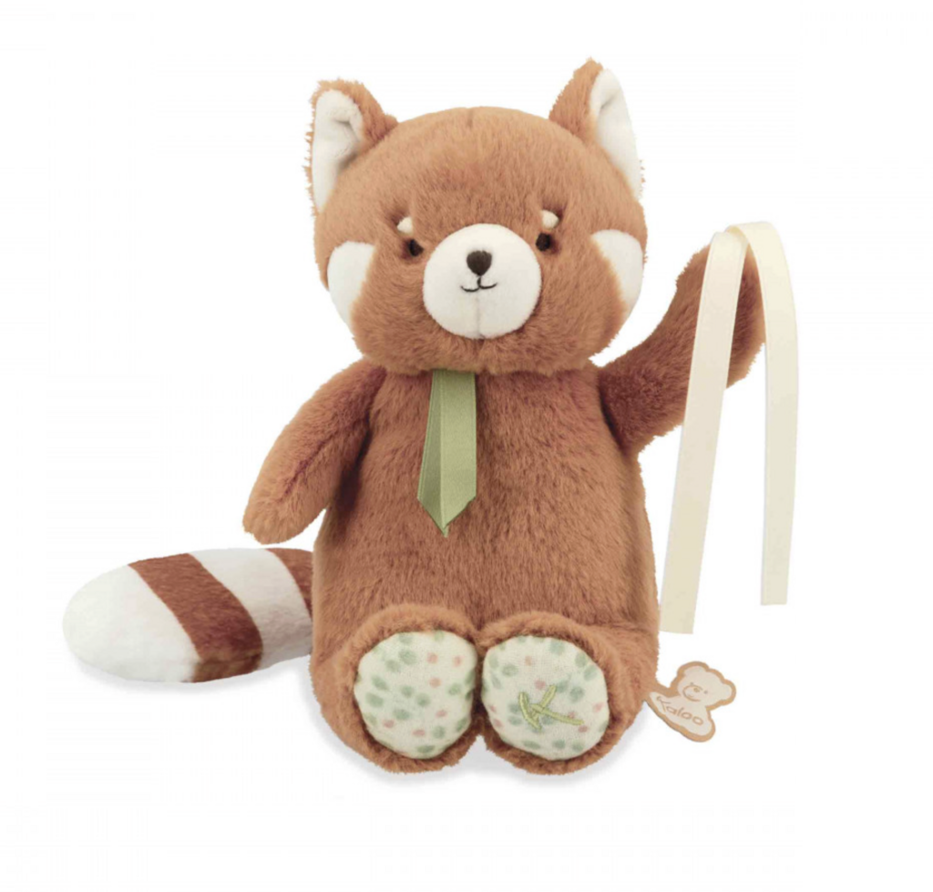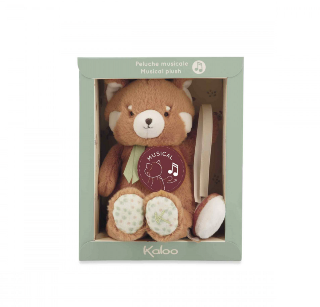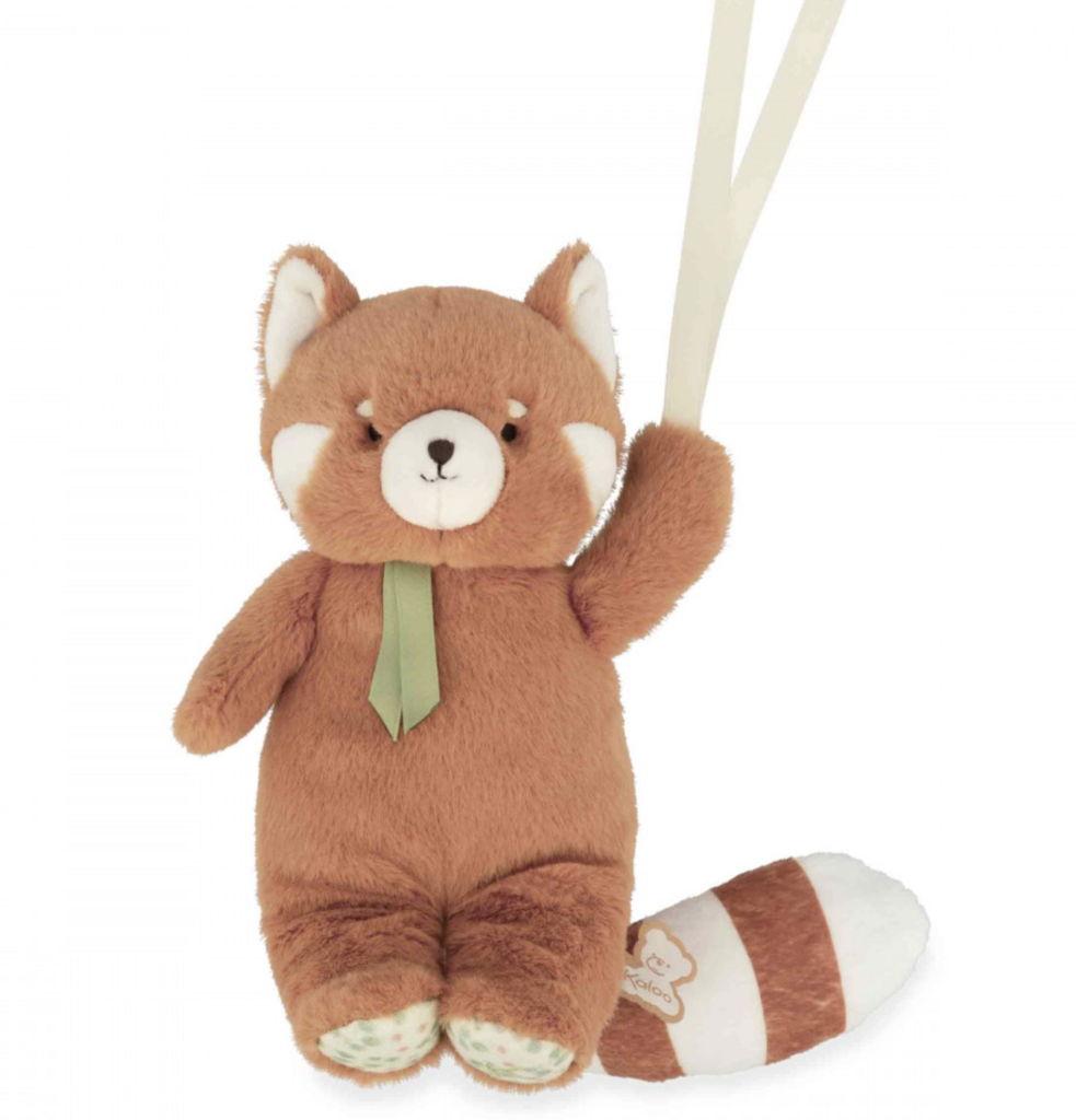 A super soft musical plush toy to help your baby drift off to sleep peacefully! Suitable for babies from birth, this musical red panda is the perfect companion to soothe your little one at bedtime. At bedtime, simply pull the tab on the panda's back to play the gentle melody of "You Are My Sunshine." This reassuring music helps your baby calm down after the day's stimulation and enter a state of relaxation, promoting sleep. By associating music with bedtime, your baby understands that it's time to sleep, establishing a secure routine. In addition to its adorable face, this red panda has a super soft coat that's perfect for cuddles! Your baby will love exploring the pretty green ribbon around its neck with their little hands. Easy to attach with a ribbon loop, this musical red panda can accompany your baby at home or on outings. At 20 cm tall, it's easy for little hands to grasp and handle. This incredibly soft Kaloo musical red panda is the perfect baby gift. Carefully crafted, this musical plush toy is made of synthetic fur (recycled polyester) and cotton muslin, with recycled polyester filling. Machine washable at 30°C, this musical plush toy belongs to the Petit Songe collection: a sleep-themed range designed to create a soft and soothing atmosphere in the nursery, with comforting companions to accompany baby and parents during the bedtime ritual.