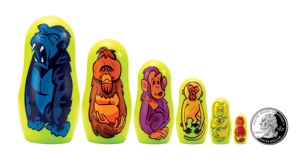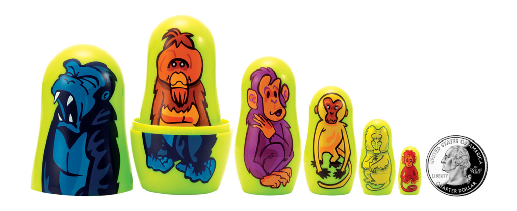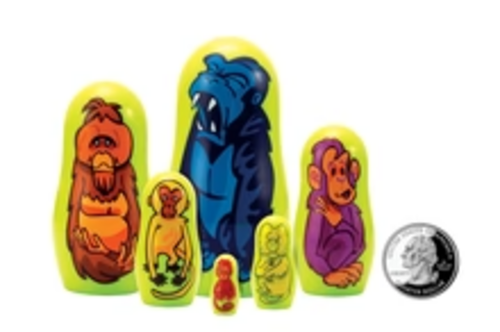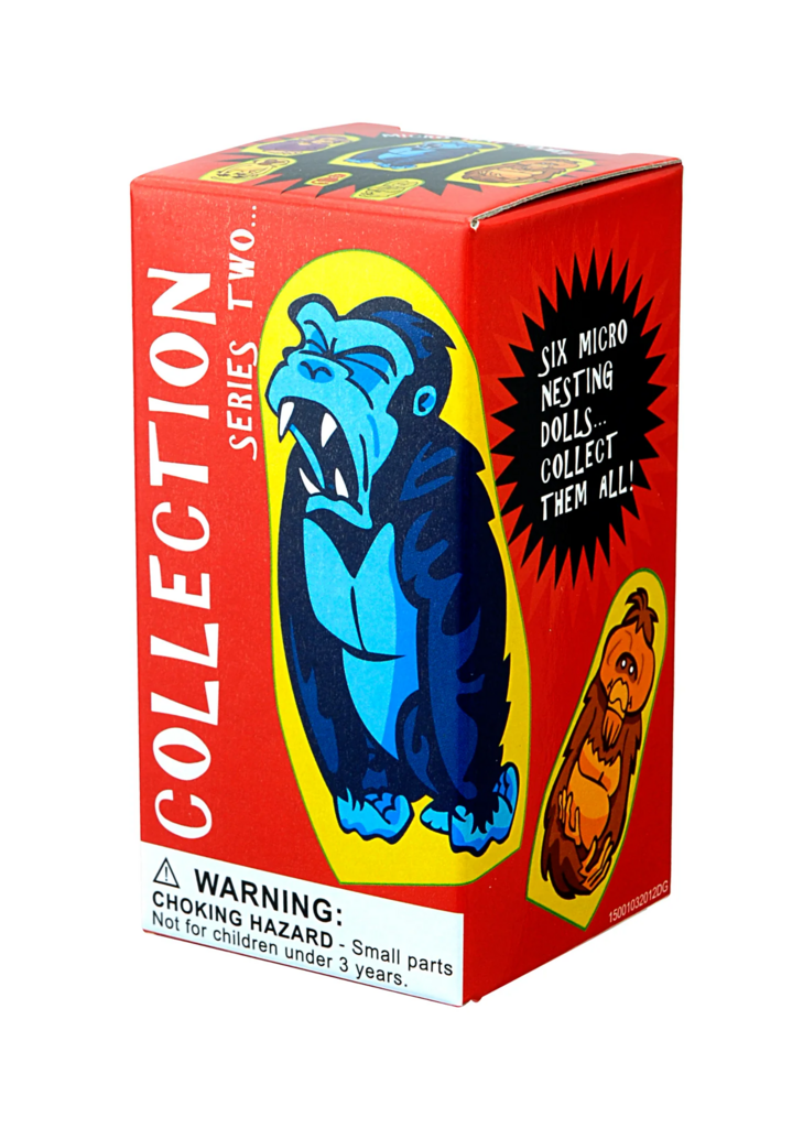 Micro-Gorilla 6 piece Nesting Doll. Tiny, cute and very collectable... the dolls range in size from only 3 1/4 inches tall to a mere 3/4 inch. Made in high-grade ABS plastic, these miniature Matryoshkas make a great addition to any Nesting Doll collection.