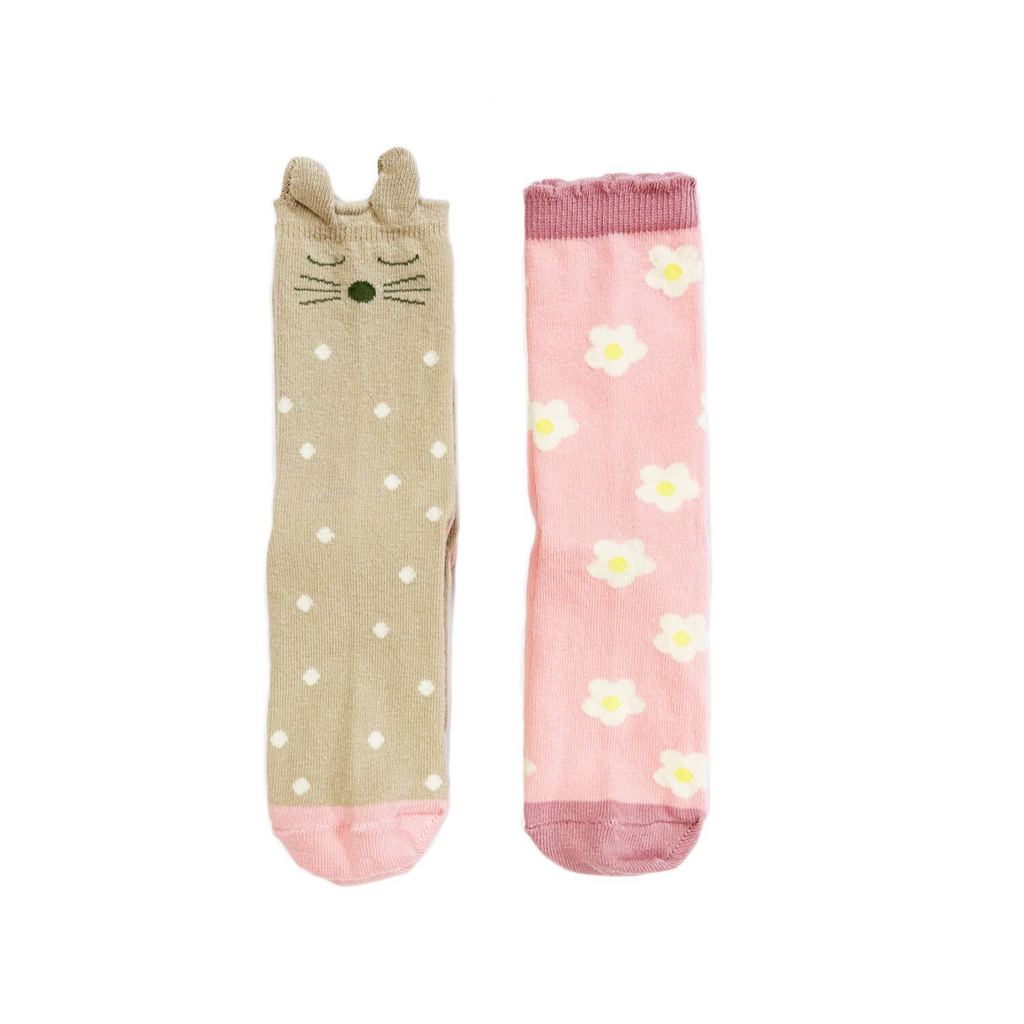 Our two pack of super soft socks feature our flora bunny and a pretty daisy print! Made with organic cotton, they're perfect for everyday activities. Match with our flora bunny collection for the perfect combo!