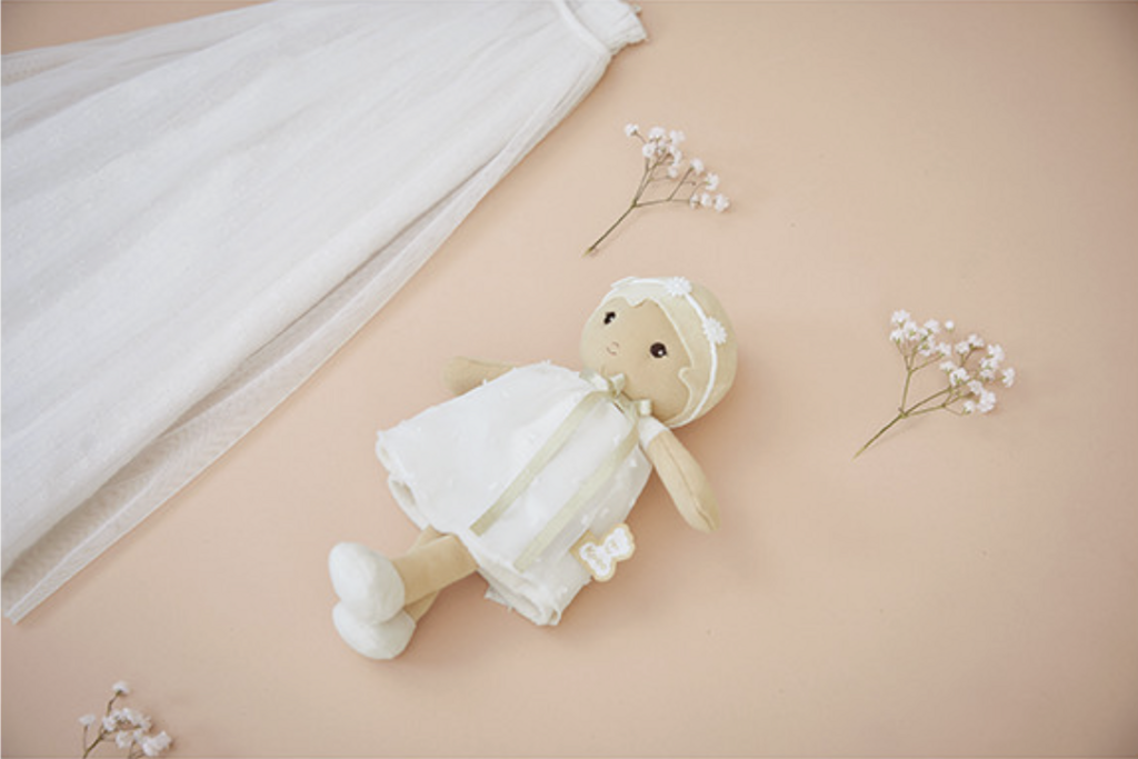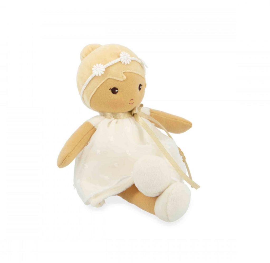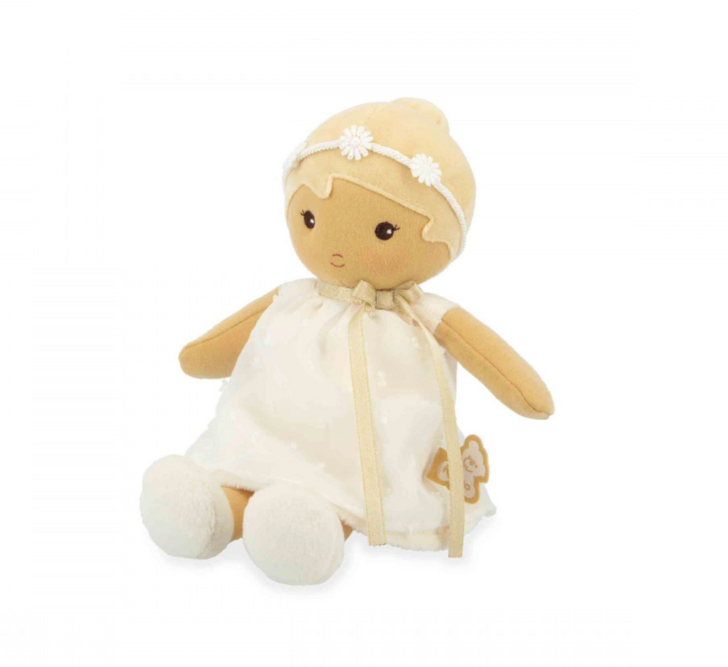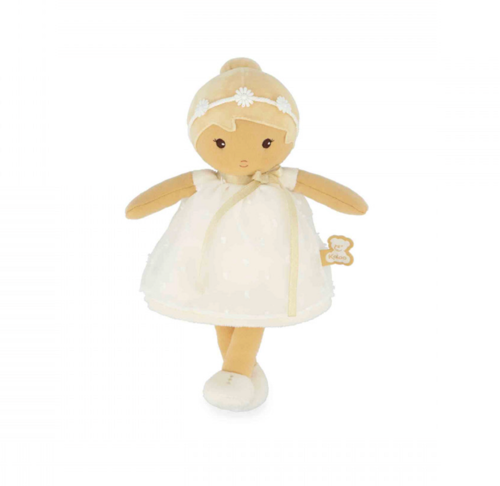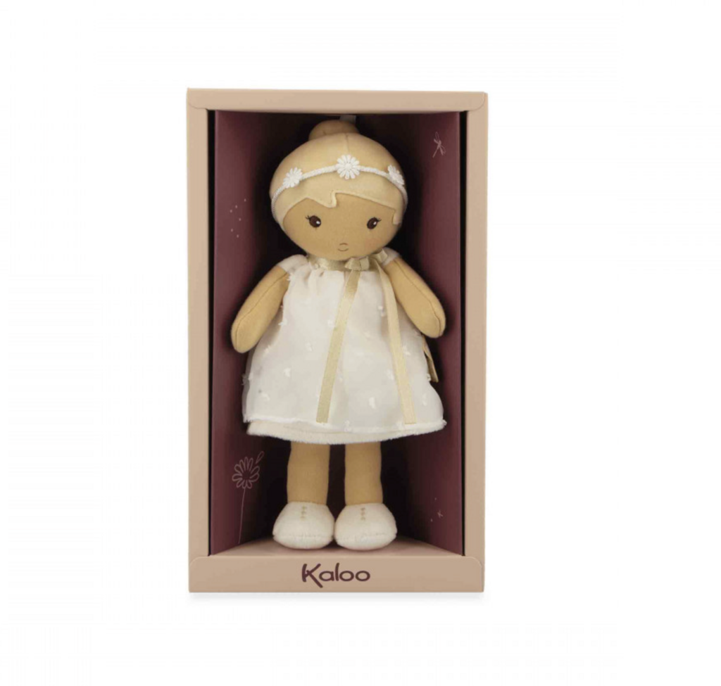 t's time to meet Daphne: a beautiful, elegant 25cm fabric doll! Suitable for babies from birth, she's part of Kaloo's Tendresse doll collection. Elegantly dressed in an ivory polka-dot organza dress, Daphne is ready to celebrate precious moments like a christening or a wedding. Her beautifully styled updo adds a touch of distinction, and her matching shoes complete her refined and elegant look. Daphne is a doll that reflects the purity and gentleness of precious moments. Her ethereal outfit is enhanced by a delicate flower crown, like a final touch of poetry. With her peaceful gaze and delicate appearance, Daphne invites gentleness and reverie. She seems to have stepped straight out of a suspended moment, where silence soothes and tender gestures comfort. She embodies those calm moments when we take the time to feel, like a light breeze caressing the skin. Incredibly soft, she's easy for little hands to grasp and quickly becomes the perfect cuddly companion. Discreet and charming, Daphné naturally becomes a part of a toddler's daily life. A small sewn-on ribbon on her back allows you to write the baby's name, making her a unique and precious friend. Presented in a pretty box, she makes an original baby gift, full of sweetness and whimsy. She's also perfect as a first doll to stimulate a child's imagination. Carefully crafted, this fabric doll is made with at least 80% recycled materials, including its recycled polyester stuffing. Machine washable at 30°C, this adorable doll is ready to be adopted and loved for years to come!