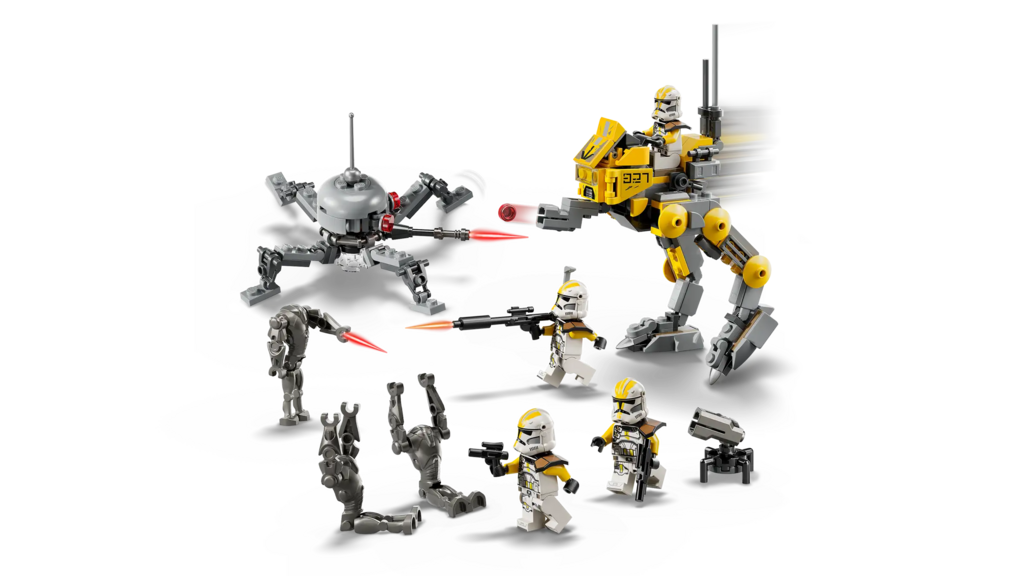 - 4 LEGO® Star Wars™ minifigures – 4 327th Clone Troopers with a blaster pistol, 2 blasters and a blaster rifle, plus 3 Super Battle Droid LEGO figures