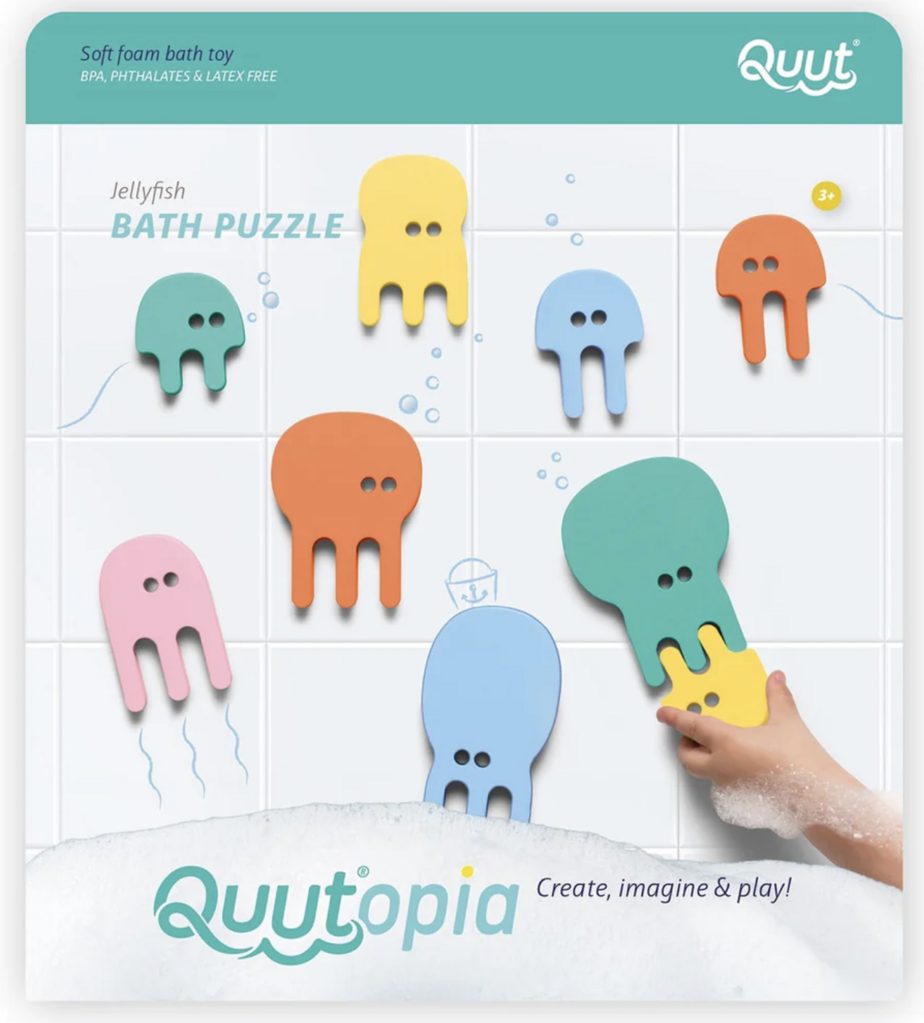 Bath time is even more fun with this intriguing jellyfish bath puzzle. Matching the shapes and colors of the different jellyfish helps your little ones improve their fine motor skills. The shapes float on water and easily stick to the side of the tub or shower to make your own creations. The soft foam used is BPA, phthalates and latex free and is recyclable. All pieces do not absorb water, reducing mold and mildew