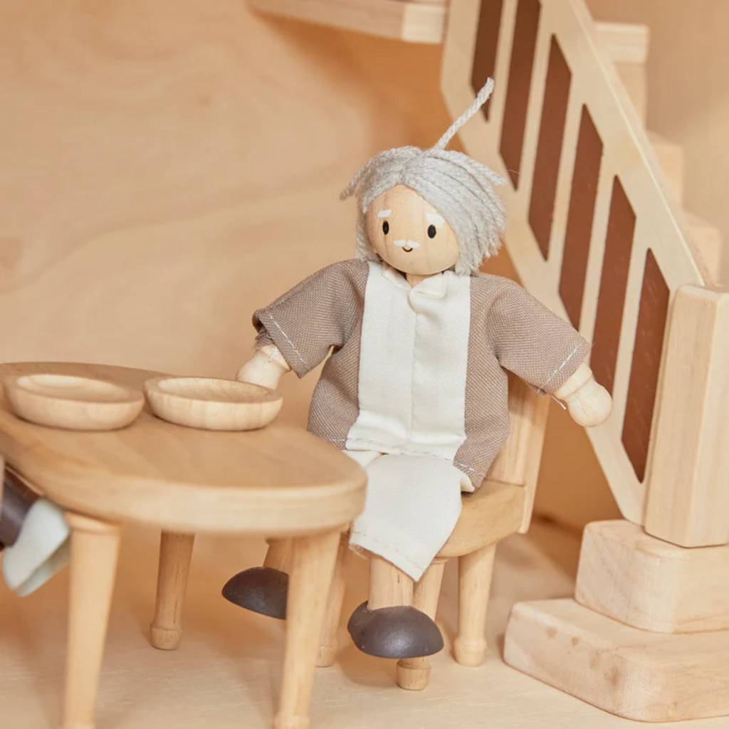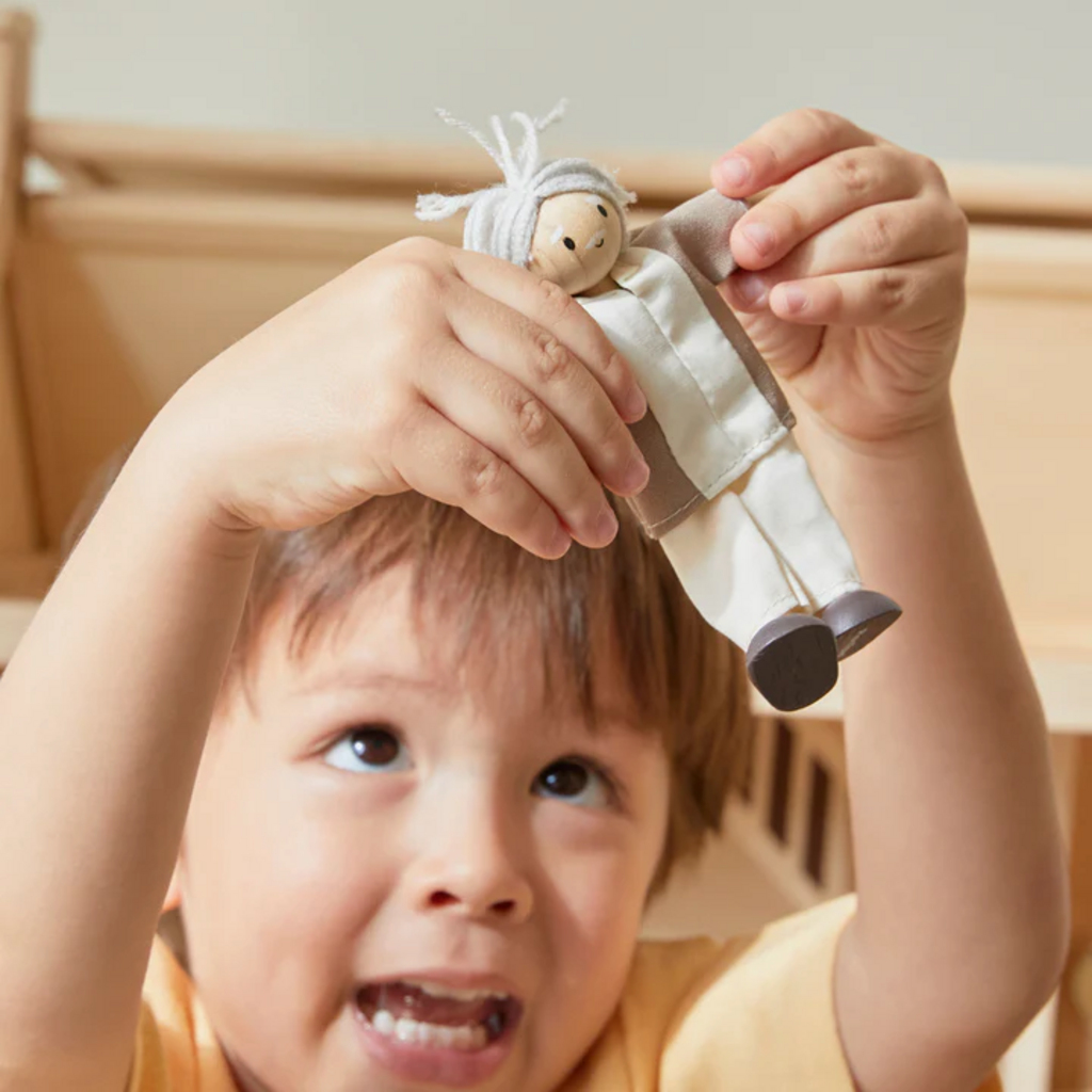 The PlanToys Doll Figure are made sustainably in Thailand. Doll heads and bodies are made of solid wood. Arms and legs are wire that can be easily shaped. This Grandfather doll has a fair complexion and grey hair