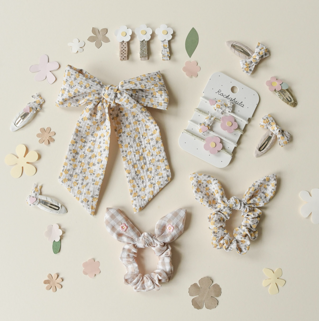Ditsy Bunny Ears scrunchies by Rockahula Kids. Add a touch of hoppiness to your hair with this set of two scrunchies, one in a pretty ditsy gingham fabric, while the other in a neutral gingham fabric with embroidered soft pink flowers.