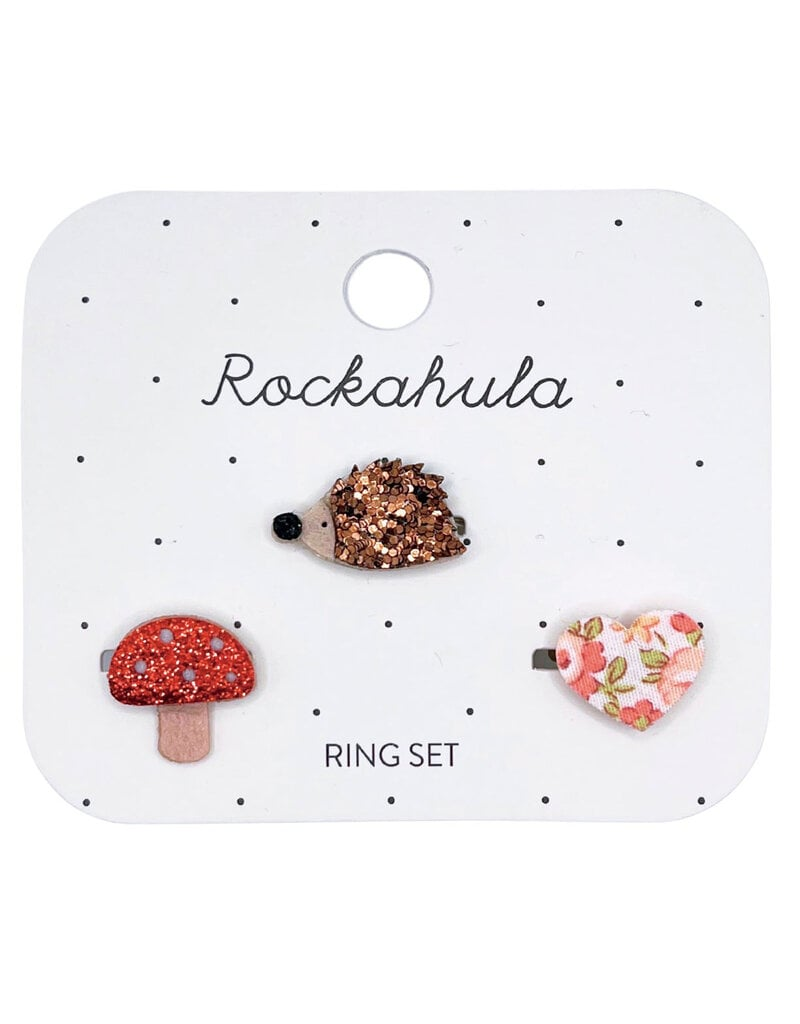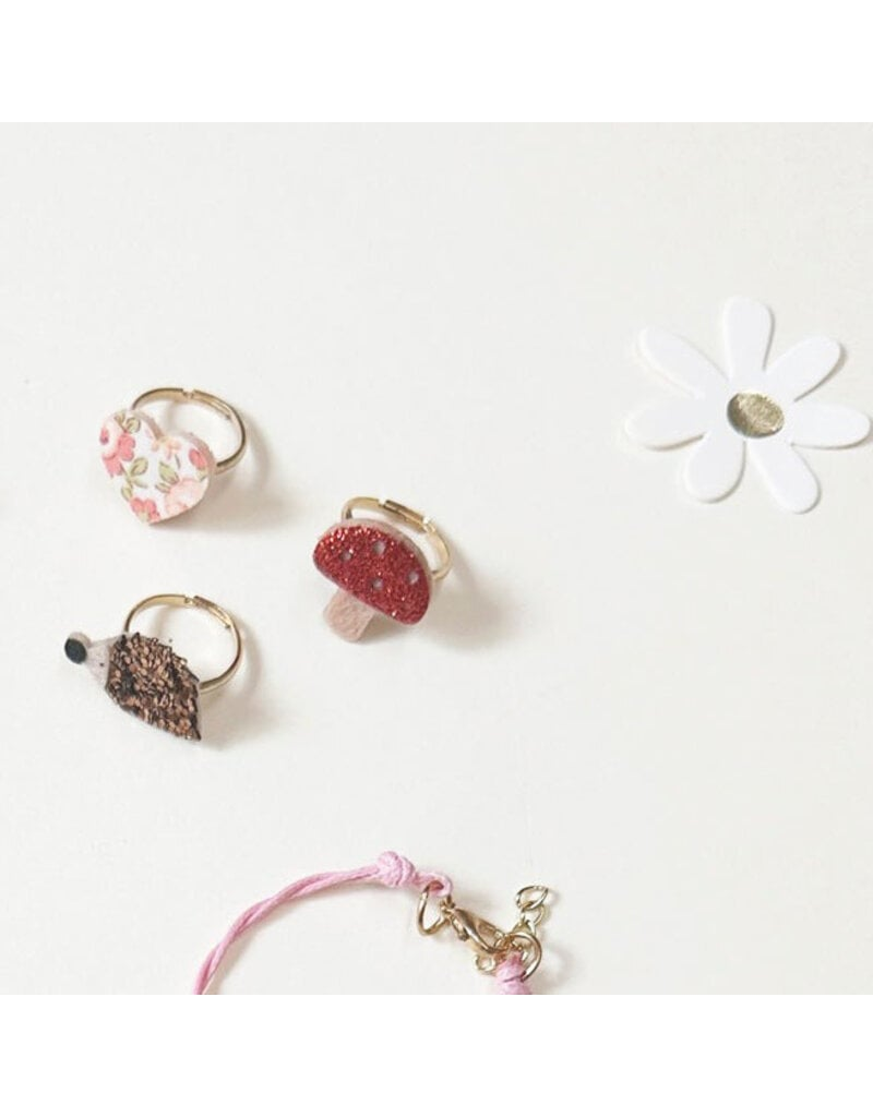 Perfect for nature lovers, this sweet set of three rings include a Hattie hedgehog, a floral heart and a glittery toadstool. Each ring is also adjustable for little fingers