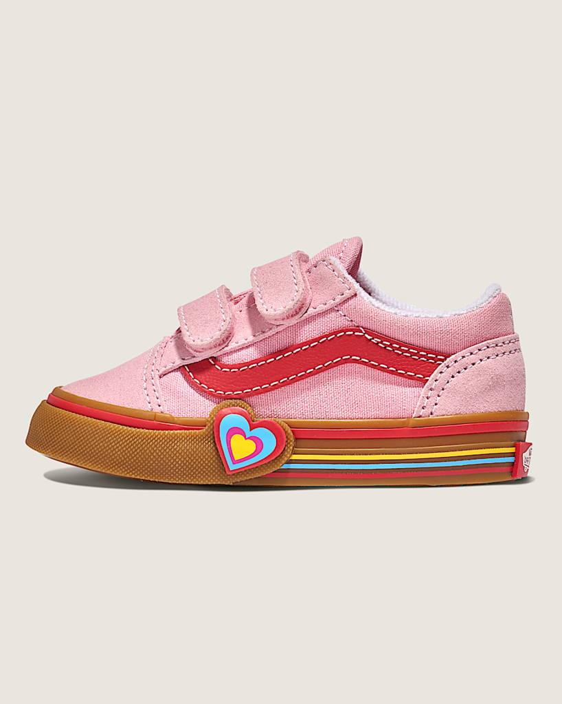 The Toddler Old Skool V Heart Shoe reimagines our iconic Sidestripe shoe by swapping traditional laces for double hook-and-loop closures. Featuring a heart along the sole and contrasting pink tones, this low-top style maintains its classic appeal while providing an easy, secure fit that keeps your little one comfortable all day. Toddler low-top shoe Recommended for ages 9 months to 4 years Sturdy suede and canvas uppers Padded collar for enhanced support and comfort Double hook-and-loop closures for easy on-and-off Durable rubber sidewall with classic foxing stripe Reinforced toe bumper for heavy wear and tear Signature waffle outsole pattern for reliable grip since '66 Vulcanized sole for superior board feel and flexibility Iconic Sidestripe™ insignia Heart pattern artwork