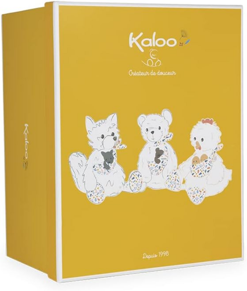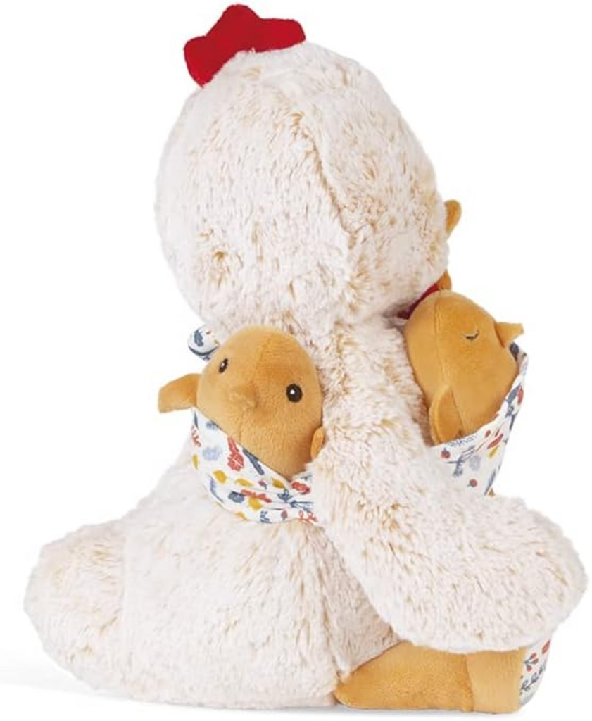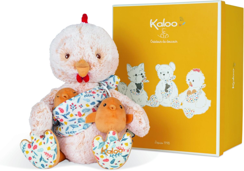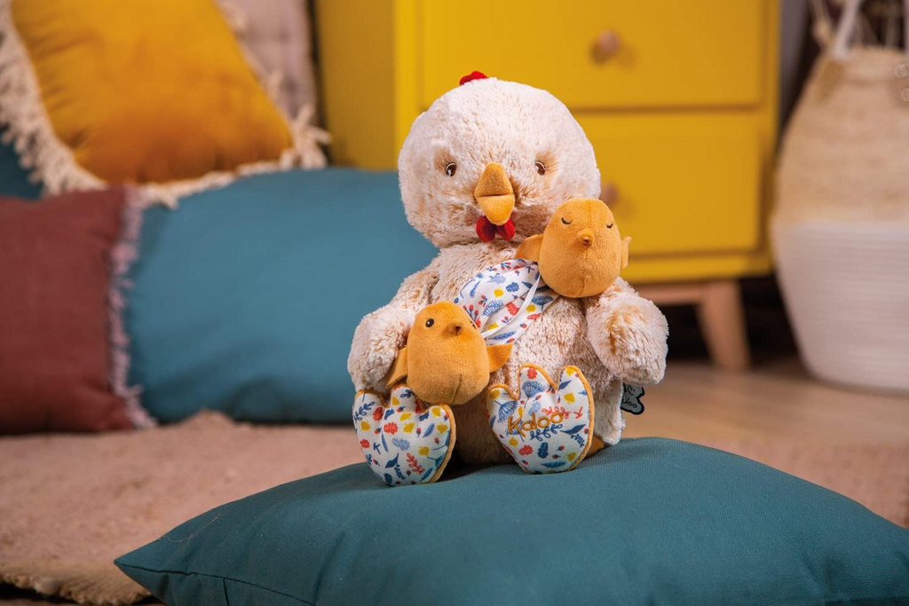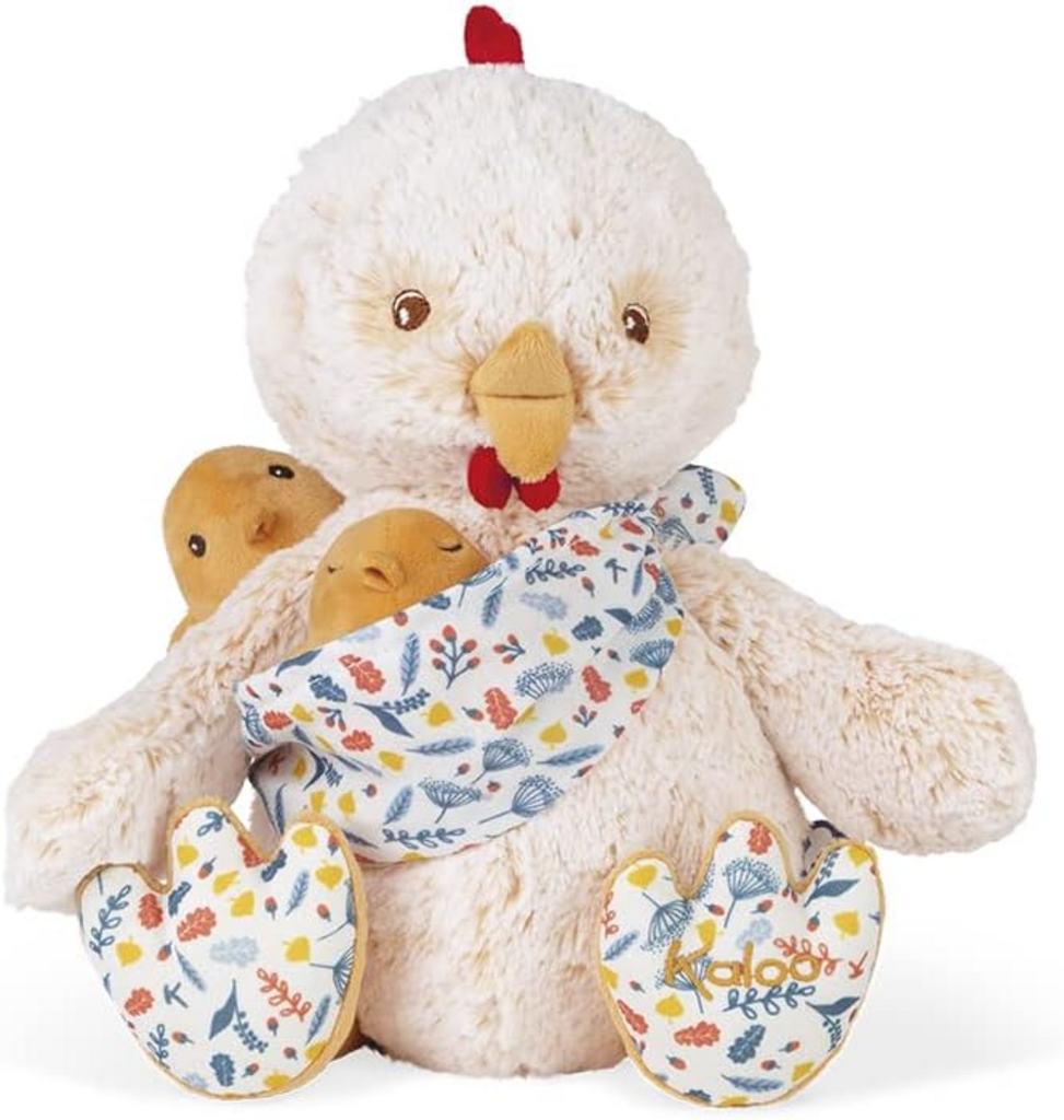 This Kaloo plush with baby reinterprets the inseparable bond between parent and child with gentleness and tenderness. Papa Poule Paul is a soft plush made from two-tone cream fur. He cuddles his chicks tenderly in a cotton muslin baby carrier with a beautiful "undergrowth" print. Each chick has its own unique expression. A powerful symbol of parental instinct and love, this gentle, protective animal represents parenthood in all its splendour. With this symbol, children can play Mummy and Daddy and celebrate the bond between parent and baby.