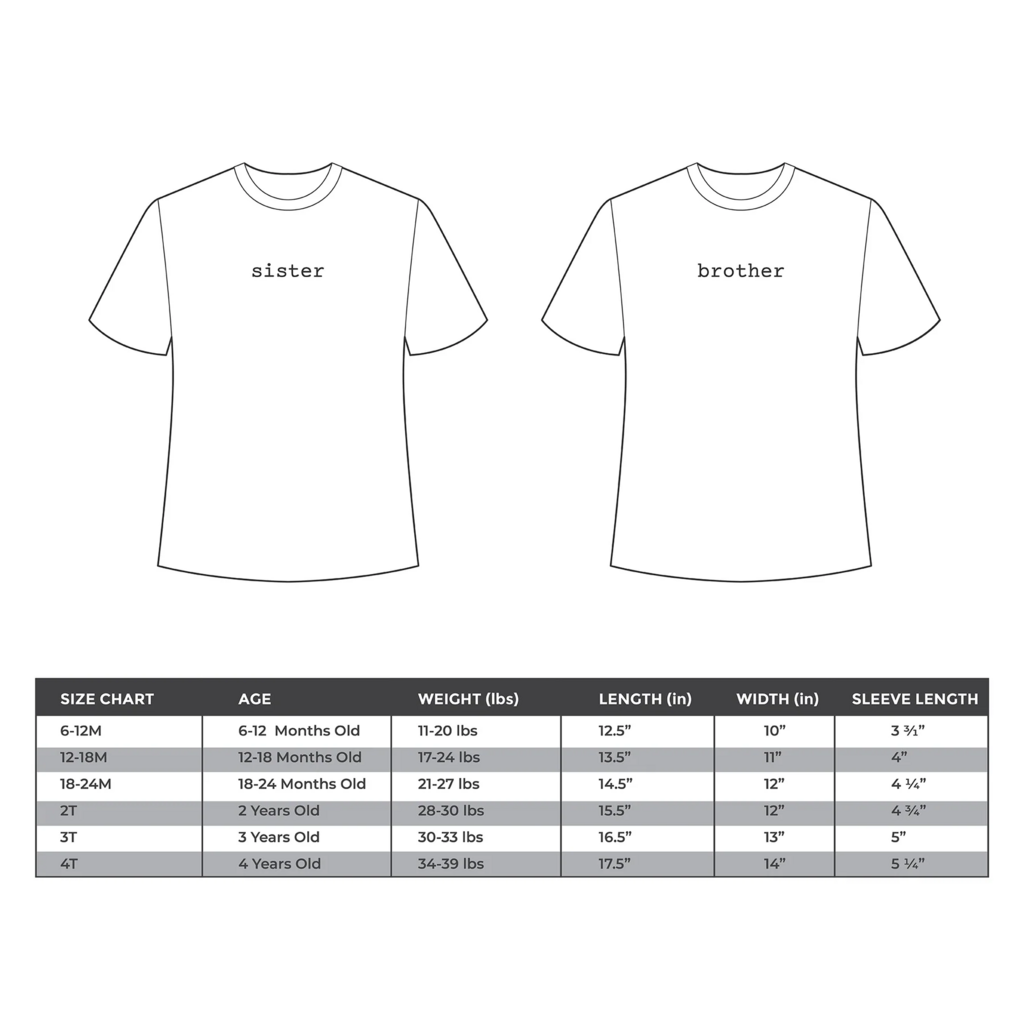 Brother? Sister? We have you covered. We offer affordable and cute clothing you can’t ignore. Short-Sleeve Tee Text is raised puffed ink Super-Soft 100% Cotton Jersey T-Shirt Top Stitched Ribbed Crew Neck Double Needle Sleeves and Bottom Hem Easy Tear™ label 100% Combed Ringspun Cotton Fine Jersey Shoulder-to-Shoulder Self-Fabric Back Neck-Tape