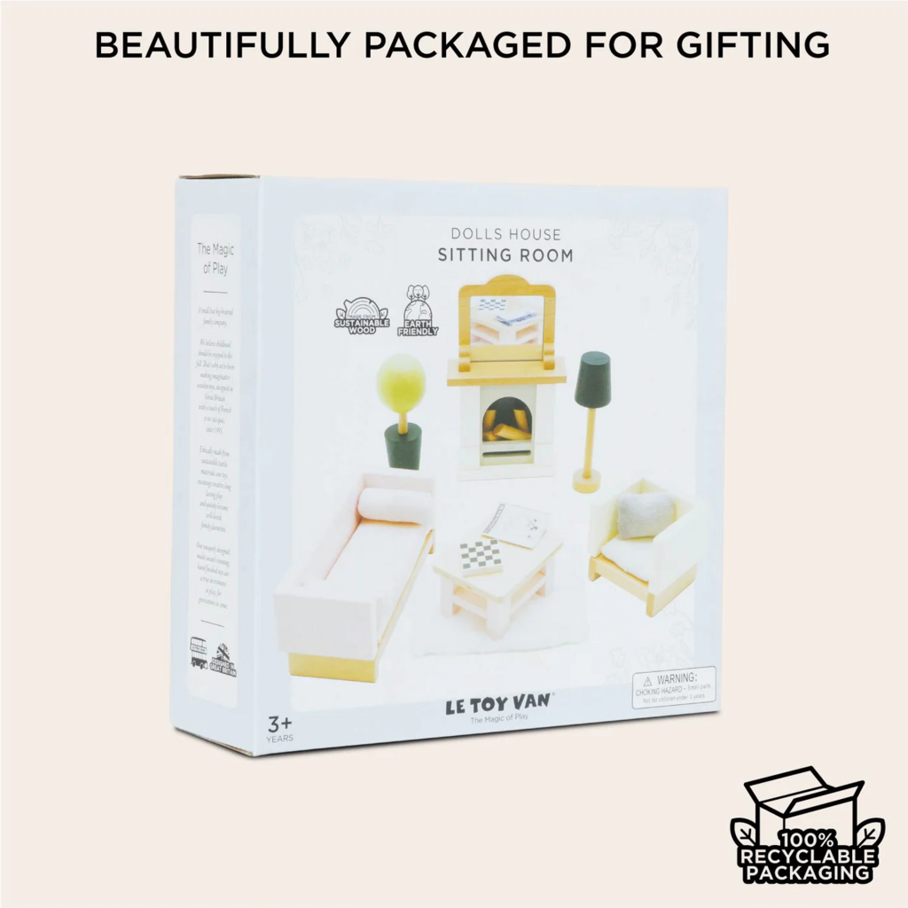 Sit back and relax with this stylish miniature sitting room, just the ticket to bring the wow factor to any child’s dream dolls house set up. Complete with 19 individual accessories, each piece is solid, sturdy and sustainable - crafted from FSC™ certified wood and built to last for generations of play.