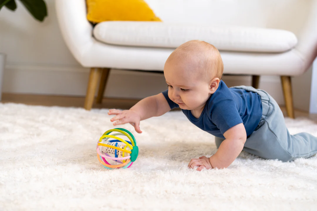 Sure to be a baby favorite for grasping, shaking, teething, and rolling. The easy-to-grasp and colored flexible tubes capture the attention of babies and caregivers, but there’s more to this brightly designed ball than meets the eye. A little shake of this colorful baby toy reveals a soft whistling sound and clacking of the hard plastic rings surrounding the center rod.
