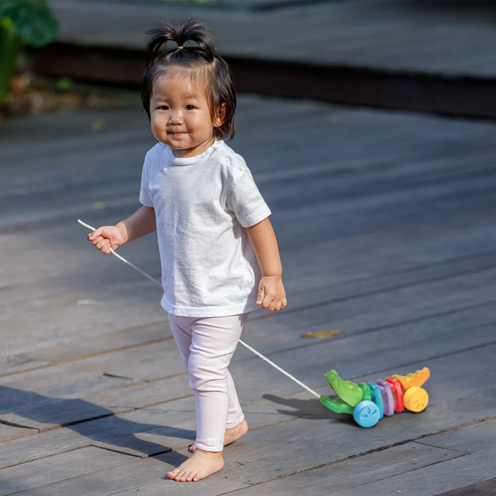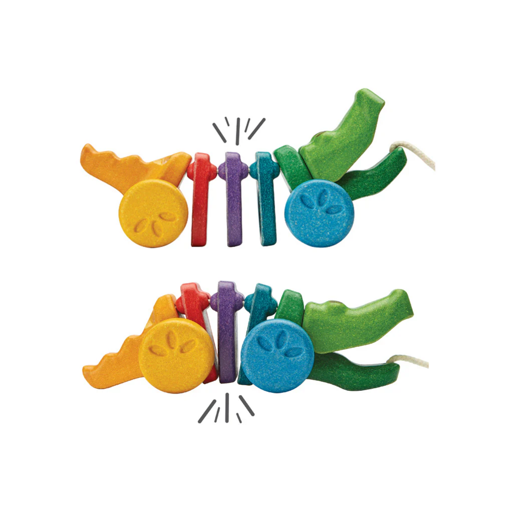 This colorful Rainbow Dancing Alligator is made from PlanWood. When children pull the Alligator, its head and tail move up and down – making a fun click-clack sound.  Makes a click-clack sound and dances as it's pulled along by a string Designed using PlanWood™, a unique PlanToys material that utilizes surplus sawdust and wood scraps to create a sustainable, flexible wooden material Finished with water based paint and non-formaldehyde, e-zero glue Sustainably made in Thailand using chemical-free rubberwood, formaldehyde-free glue, organic pigments and water-based dyes.