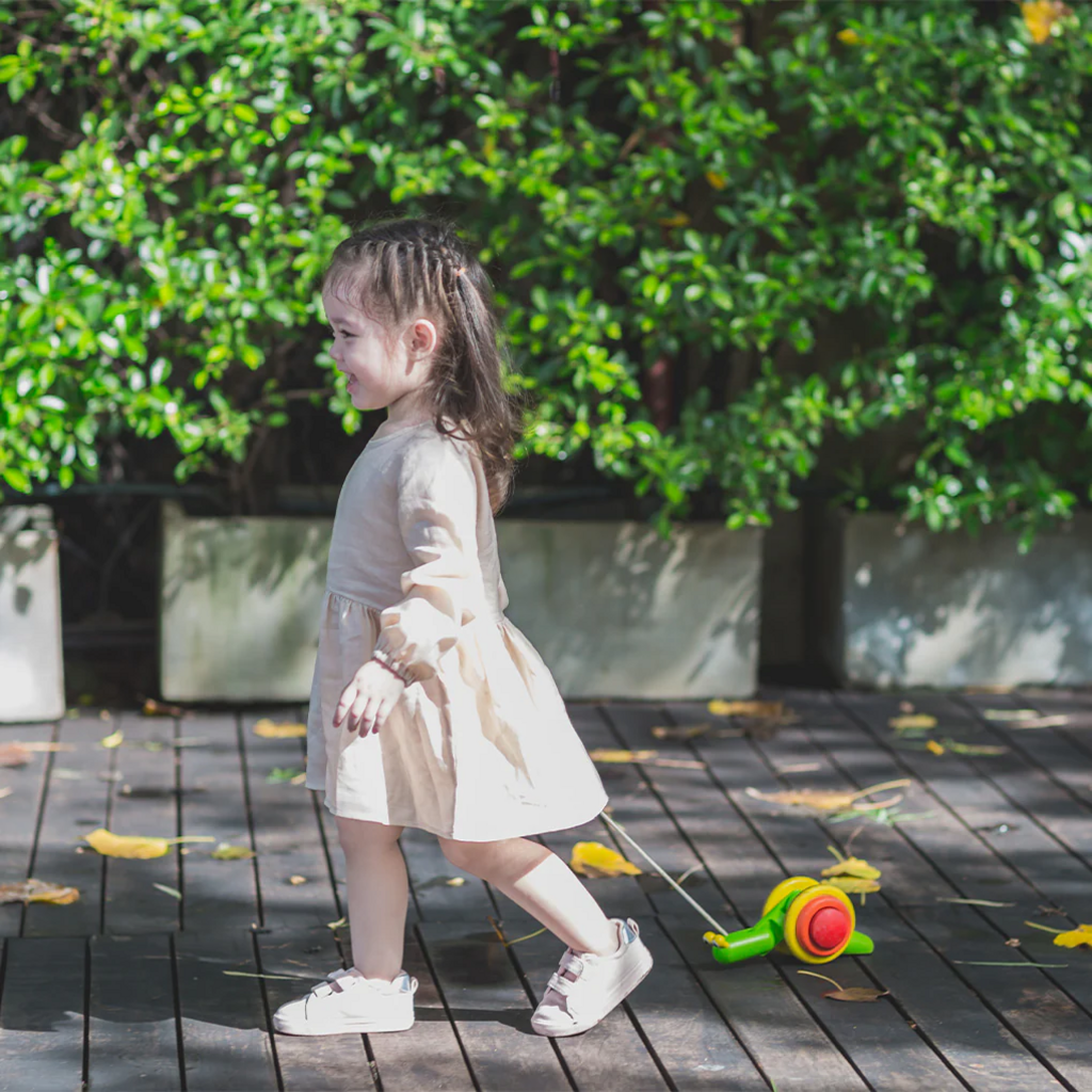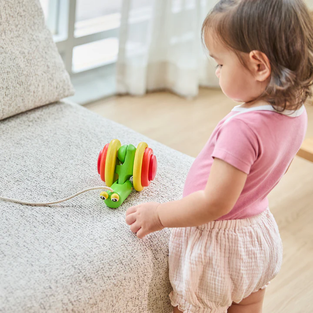 When children pull the Pull-along Snail, it inches and crawls along the floor. This toy helps develop fine motor, gross motor, and coordination skills. Both balance and coordination are developed as children practice walking and adventuring on their own while pulling the snail along. As the snail is pulled along, the body inches forward with a crawling action as it rolls on the edges of the shell. Fine motor skills are enhanced with more hands-on play when interacting with the snail Sustainably made in Thailand using chemical-free rubberwood, formaldehyde-free glue, organic pigments and water-based dyes.