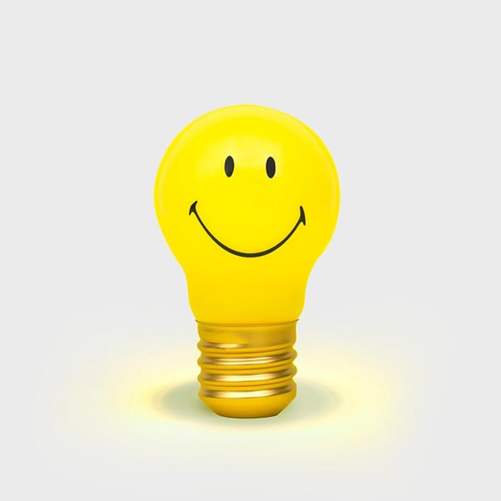 Seemingly magic bulb, lights up without plugging in or attaching to a lamp. Looks and feels identical to the iconic filament light bulb with a Smiley face.